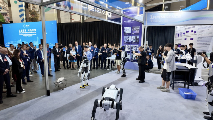 在傅利叶智能、智元机器人、联影医疗等8家企业组成的展区内,外方嘉宾们时而与人形机器人互动,时而驻足聆听无弦吉他的数字旋律,时而提出各类问题:“这款机器人是最新一代吗?”“这项技术是否实现商业化?”